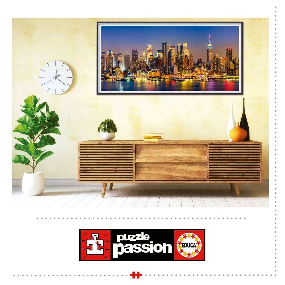 O Puzzle Nova Iorque à Noite da Educa, com 3000 peças, oferece uma vista panorâmica impressionante do skyline de Manhattan iluminado ao entardecer. Com a silhueta dos arranha-céus reflectida no rio Hudson e o Empire State Building em destaque, esta imagem captura na perfeição a energia vibrante da Big Apple.
